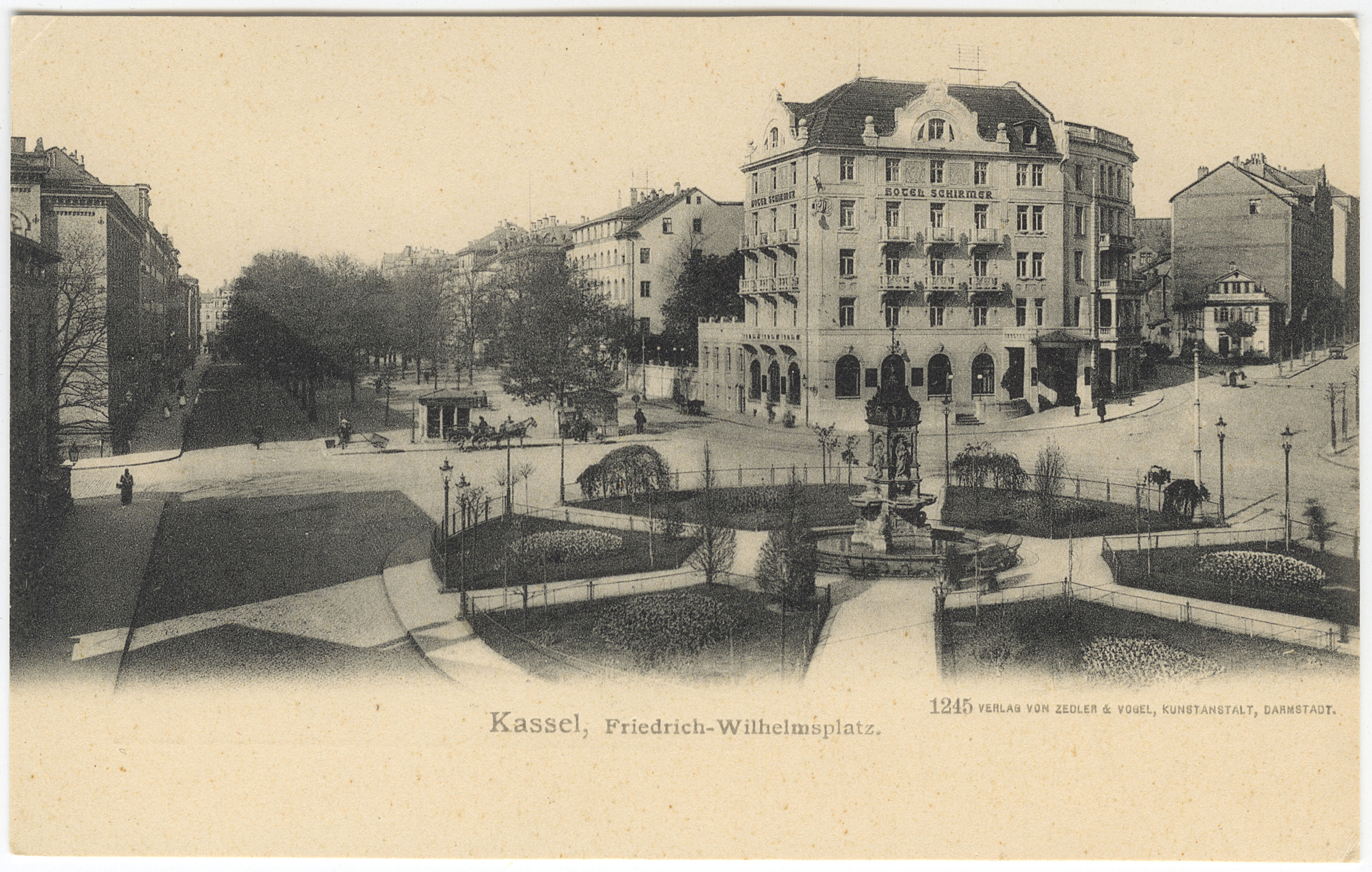 »Richtübungen auf der Dönche« – links im Hintergrund Dächer der Goßmannschen Anstalt. Ganz rechts das Kurhotel Wilhelmshöhe. Zur Dönche: Siehe das Unterkapitel »Weiteres Material zur Wilhelmshöher Militärgeschichte« auf dieser Seite. »”« – im Hintergrund das Kurhotel Wilhelmshöhe an der Einmündung der heutigen Konrad-Adenauer-Straße in die heutige Druseltalstraße (damals Kohlenstraße).
