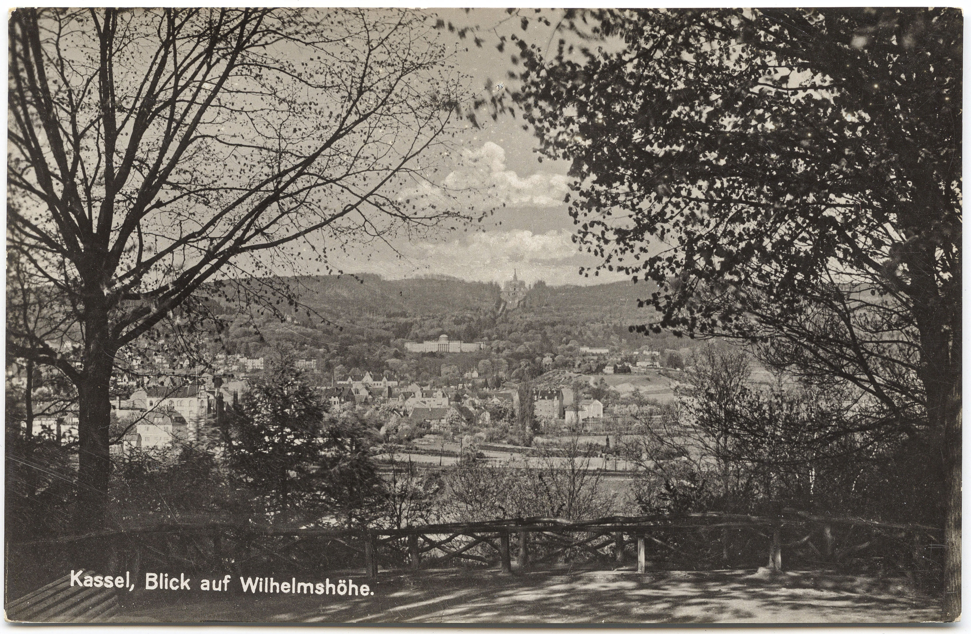 Ca. 1910: Links direkt über dem dunklen Waldrand das Hotel Schombardt am Rammelsberg, ein Stück rechts davon an der Wilhelmshöher Allee das Straßenbahndepot. Links oberhalb des Schlosses, dreigiebelig: die Bürgerschule.*MA