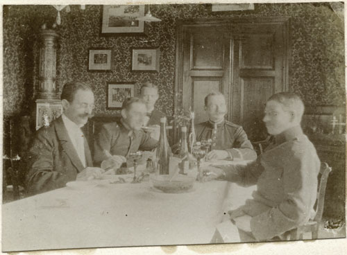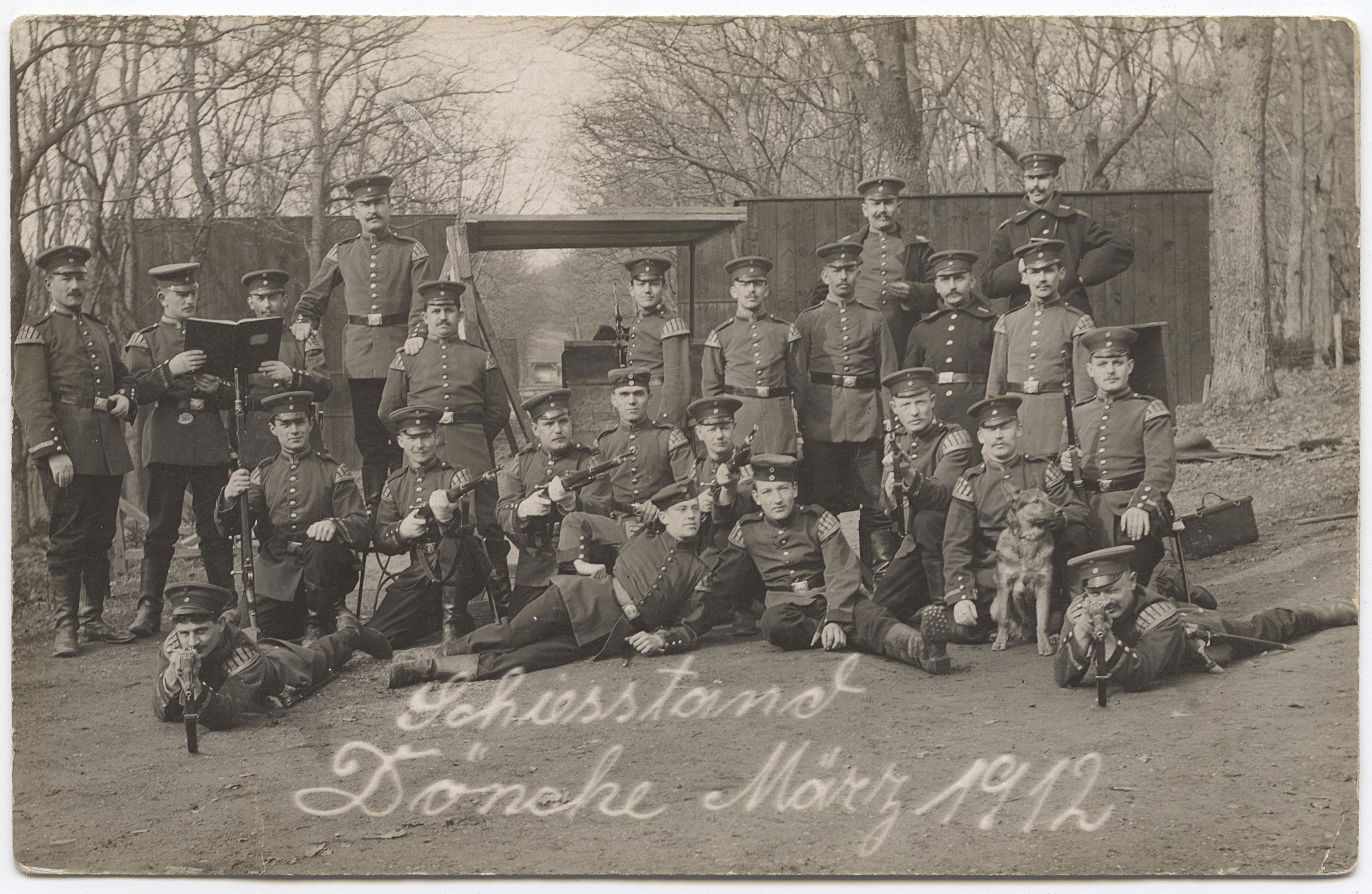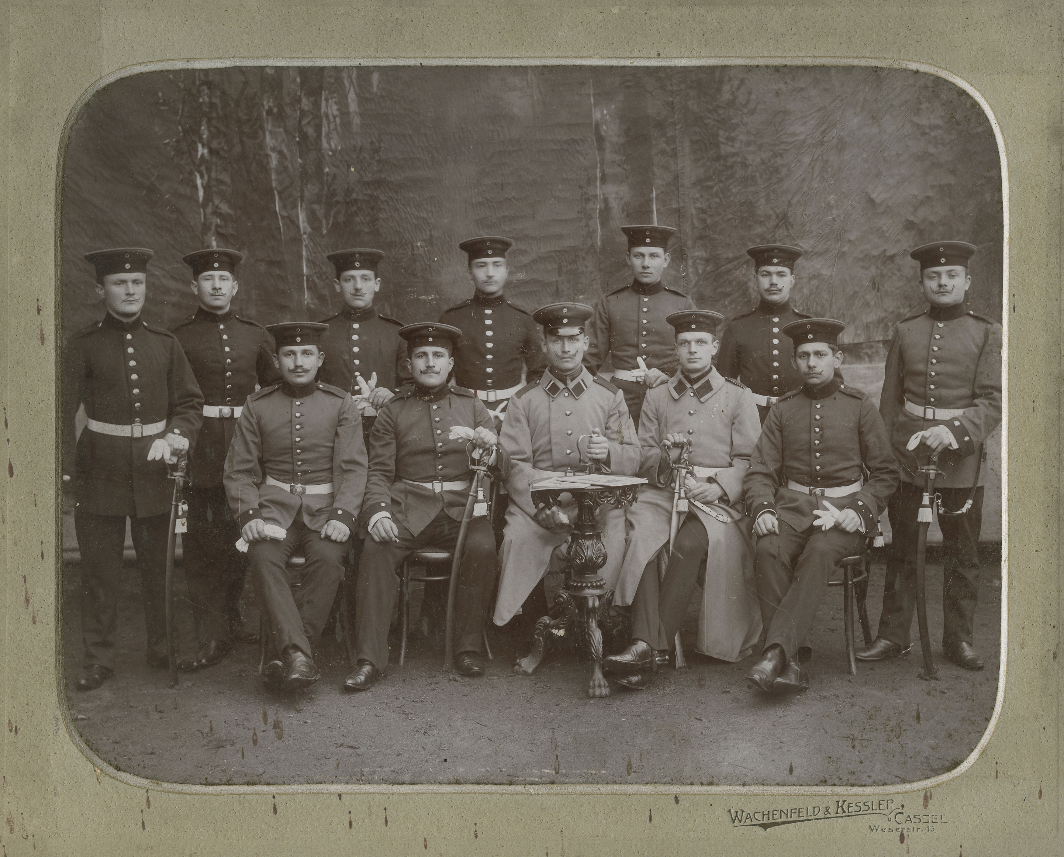 14. In der Kaserne. Rückseitig beschriftet: »von links nach rechts: | Krambeck | Peters | Wolf | Stolley | Seeburg | Ufers | Ritzenhof | Golle«.*MA |