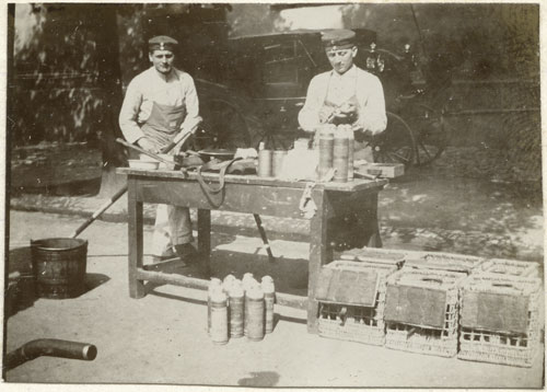 »vor der Geschützrevision« im Marstall-, also Kasernen-Hof. »”« »Lux, Zeidler, Schul,« Hier klicken, um zum Foto der Doppelseite 10 zu springen. |
