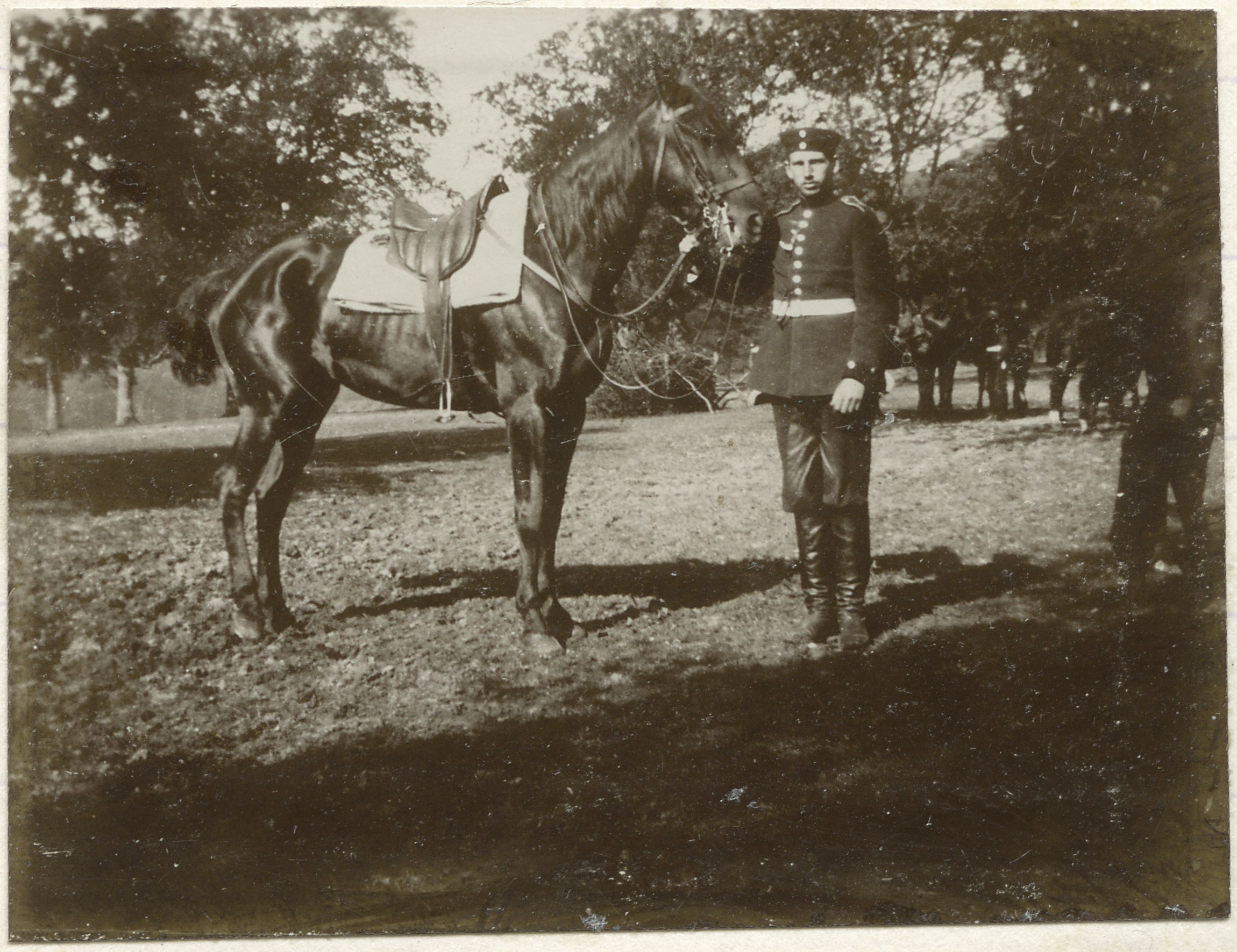 Das »Artillerie-Album«Im Oktober 2020 konnte ich für mein privates Stadtteilarchiv, das »Mulang-Archiv«, ein kleines Album erwerben, das ein Soldat der Artillerie um 1900 angefertigt hat. Der Mann, dessen Name aus dem Album nicht hervorgeht, hat 77 Fotografien und eine Postkarte in ein Notizbuch (10 × 16,3 cm) eingeklebt und die Bilder kurz kommentiert. Die meisten Fotos sind Kontaktabzüge und haben ein Format von nur ca. 50 × 38 mm. Die ersten beiden Fotografien zeigen das Hotel »Ridinger Schloß« in der Villenkolonie Mulang, Löwenburgstraße 3, in dem der Autor des Albums offenbar viel verkehrte oder zeitweise wohnte. Es folgt ein Foto der Kaserne im Marstall auf dem Schloßplateau und zahlreiche Fotos von Park-Sehenswürdigkeiten, wobei zunehmend Wachposten zu sehen sind. Zwei Fotos, die aus dem »Ridinger Schloß« aufgenommen sind, zeigen seltene Blicke auf die junge Villenkolonie. Weitere Bilder dokumentieren Wilhelmshöher Kasernen-Alltag, Richt- und Fahrübungen der Artillerie. Pferde werden porträtiert und ihre Namen genannt, wir sehen Alltagsleben und Feldübungen, etwa das Anlegen von Schützengräben und Zielscheiben. Das Album enthält auch Fotos aus Münden an der Weser, aus Wabern, aus Assenheim bei Friedberg und aus Laubach. Im Folgenden werden zunächst alle Doppelseiten des Albums gegeben, sodann die bearbeiteten Scans der Einzelfotos mit Ausnahme solcher, die nur die üblichen Sehenswürdigkeiten zeigen. (Einige Bildbeschriftungen des Albums sind in Kurzschrift verfaßt, wohl nach dem System Stolze-Frey, offenbar zwecks Codierung vor allem von Eigennamen. Die Kurzschrift konnte bisher nur in einem einzigen Falle halbwegs entziffert werden. Wer kann helfen?) Es folgt weiteres Material zur Wilhelmshöher (und Kasseler) Militärgeschichte, darunter 22 Privatfotos aus den 1940er Jahren, als das Schloßhotel Wilhelmshöhe Militärstandort war. Inhalt dieses Kapitels