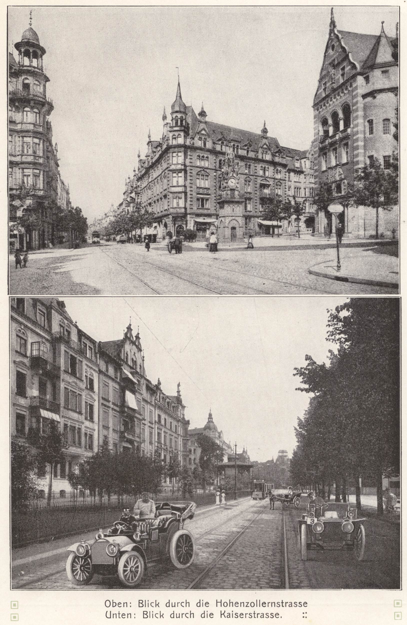 11 Links unten: Der Bauplatz der Villa Mummy, Kurhausstraße 13; rechts im Bild die Villa Henkel, Kurhausstraße 7. Hier klicken für einen Bildausschnitt mit Straßennamen und Hausnummern. Rechts oben: Blick aus der Burgfeldstraße 8 nach Nordwesten: links die Schloßteichstraße 5, dann Schloßteichstraße 3 und Schloßteichstraße 1. Rechts unten: Blick aus der Burgfeldstraße 8 nach Westen: Schloßteichstraße 7, dahinter Lindenstraße 2. Mitte hinten: Villa Henkel. Hier klicken, um zu den Einzelfoto-Scans dieser Doppelseite zu springen. |