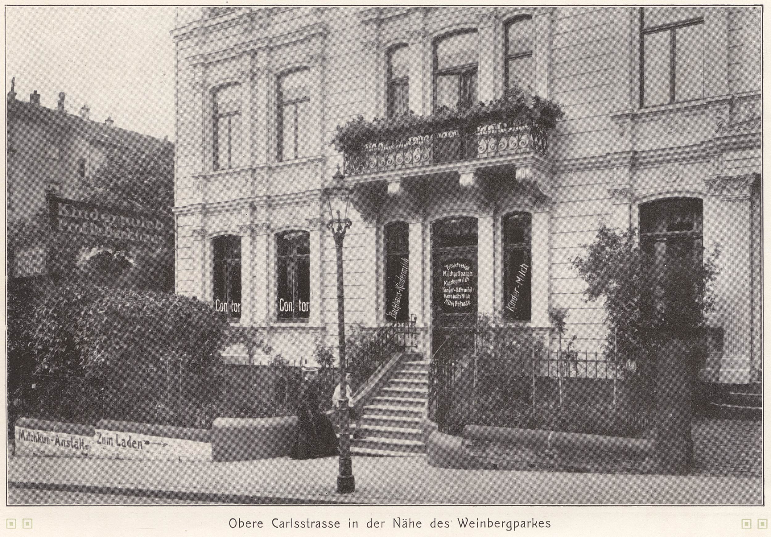 14.4 Der Schmidtmann-Bau Schloßteichstraße 10 von Süden, von der Brabanter Straße her aufgenommen, ca. 1895. Auf dem Balkon gewiß Georg Schwartzkopff. |
