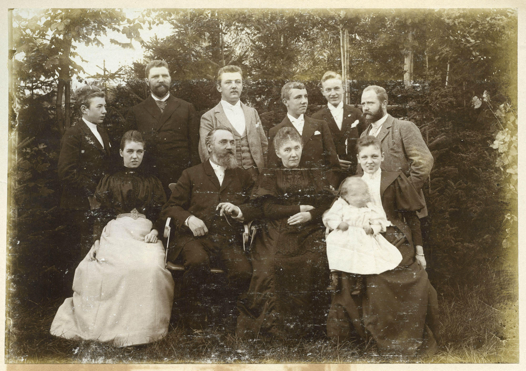 13.4 Heinrich Schmidtmann und seine vier Söhne (v.l.:) Karl (*4.3.1878), Fritz (*16.10.1879), Hermann (*20.11.1875); rechts vom Vater sitzend: Christian (»Christel«, *2.3.1872). Aufnahme im Garten der Burgfeldstraße 8, links im Hintergrund der Schmidtmann-Bau Burgfeldstraße 7. |